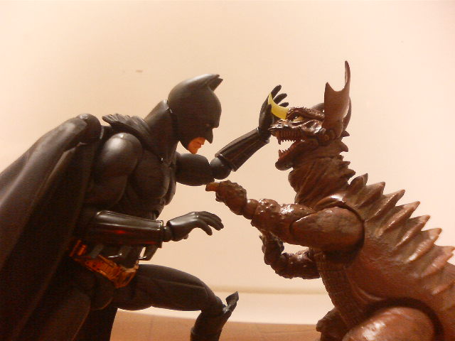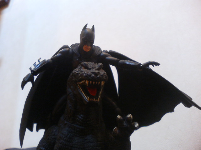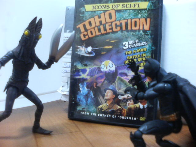 それでも心静かに、吉報が届く努力はしているつもり。 さて。 いつものショップで 特撮リボルテック・バットマンがべらぼうに安かったので『今買わないで後悔するより、買って後悔した方がまし』と購入する。 可動はもちろんのことだが、マントも三枚に分割、劇中のイメージを大事にしております。 まるで青空が、そしてヒーローポーズが似合わないヒーロー、バットマン。ゴッサムは今日も雨だった。 うちで絡ませられるのはソフビ怪獣だけだよ! がんばれバットマン! 嘘かマコトか、ゴジラシリーズの没企画の中に『ゴジラ対バットマン』というのがあったそうだ。 等身大ヒーロー対巨大怪獣の設定はかなり無理があると思うが、実現していればバットマンはフランケンのように巨大化、もしくはスパイダーマンのように日本オリジナル巨大ロボを……。 でも企画時期から考えると、バットマンはあの青いスーツでの登場だったんでしょうな。 海外ヒーローの次は海外DVD。 これまたべラボーな安さだったのでおもわずポチった『TOHO-COLLCTION』。東宝特撮映画の北米版DVD三本パック。 以前購入した『TOHO- PACK』のようにボックス仕様でくるかと思ったら、なんとケースが一つ。 へ? と思い中を開けると ホルダー一つにディスク三枚がぶっ差してある! コロンビアピクチャーズの正規品ですよ。 実にアメリカンな仕様だ。『本編見れればいいんでしょ? どうして日本のDVDは外側にこだわるのレスカ?』 というメーカーさんの声が聞こえてきそうだ。 内容は『モスラ』『宇宙大戦争』『美女と液体人間』のバラエティに富んだ三本。 目的は『モスラ』だったのですが、これがまあ、画質も申し分なく、日本語音声ノーカットでいうことありませんでした。巨大な芋虫がその時代のシンボルをへし折るビジュアルは今見ても鮮烈ですな。 ディスク一枚につき、日本語版とえ海岸版の2バージョンが収録。日本正規品のような映像特典がないのが残念ですが、美麗画質の本編さえみれりゃあええ。わしと竜馬さえおりゃいいんだ。 同じ特典なしのデアゴスティーニ一冊分で三作見れるお買い得品でありました。 と、ささやかな幸せを満喫しつつ、次へ邁進したいと思います。 夏のオーズ映画で こんなことされたらねえ、がんばるしかないですよ。