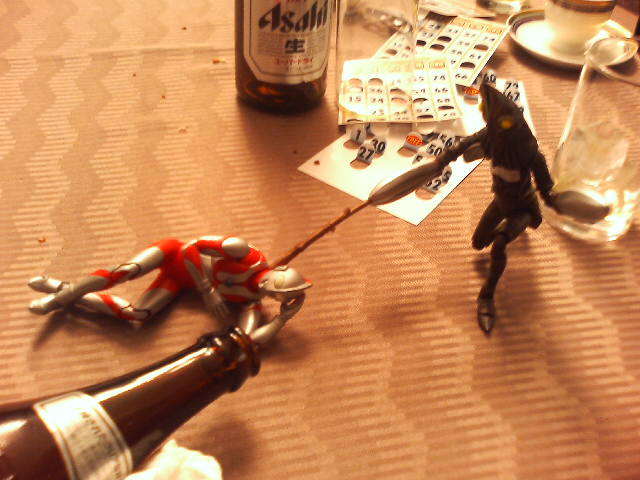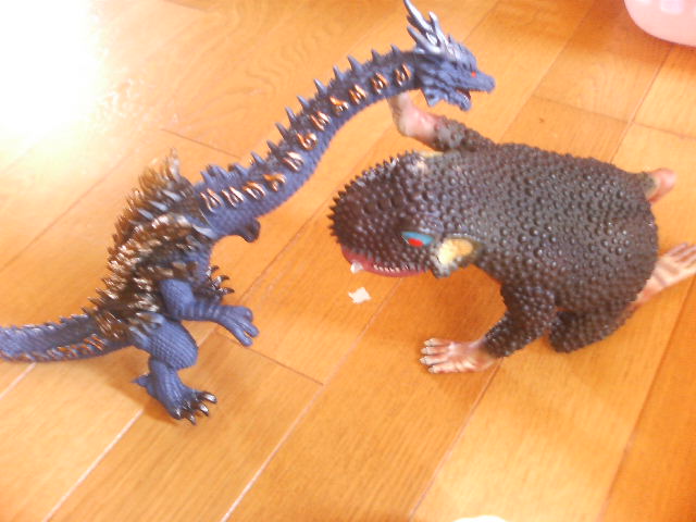 昨日、子どもが卒園式でした。卒園祝いにウルトラマンマックスのナツノメリュウがほしいというので、買ってもらっていた。普通そんなもの欲しがるか? という疑問はさておき。子どものものでも何でもうちに来ることは変わりない。半分俺のものだ。 そこで、うちにある『赤影』の千年蝦蟇ソフビとナツノメリュウを並べて『やや怪竜大決戦』をやってみると ナツノメのほうが首長いなあ。マックス怪獣は完全生命体イフを買い逃したので、再販してくれんかなあ。ソフビ道もまた茨の道なり。