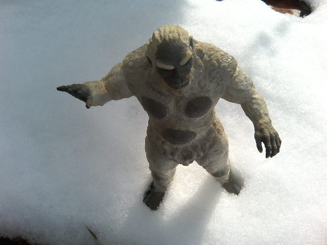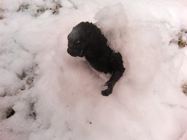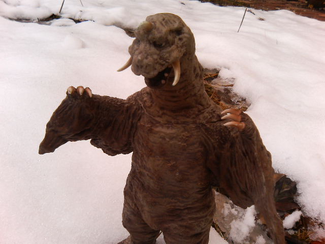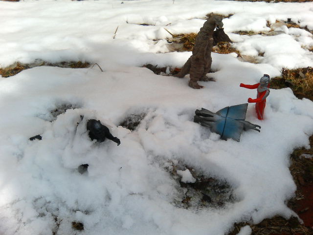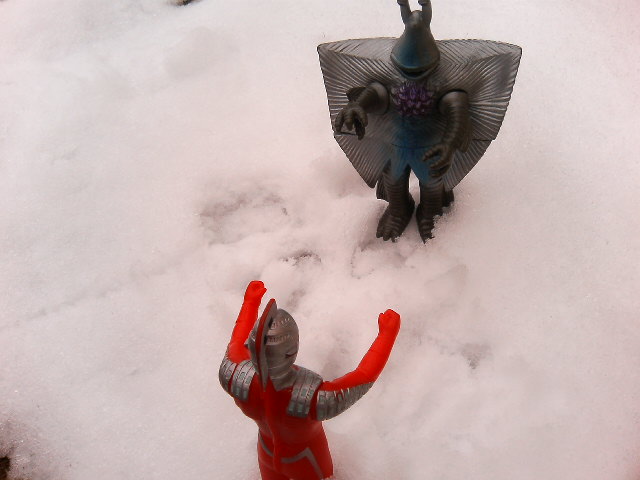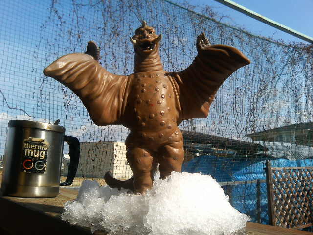 ◎『海賊戦隊ゴーカイジャー』はあちこちで好評なので、特に言う事はありますまい。 歴代戦隊大集合、という売りは別にして面白い、と思ったのは、主人公たちが『スーパー戦隊』を自覚しないところ。たまたま寄った星で、五色の戦闘服に着替えて暴れただけ、それが地球人にはスーパー戦隊に見える。 これは、仮面ライダーアマゾンが、マフラー、ベルト等々で子供に『密航オオトカゲ男』から『仮面ライダー』に認定してもらったエピソードにも似ている。マサヒコ君に出会わなければ、彼のポジションはどうなっていただろうか。 ゴーカイさんも後々スーパー戦隊を襲名するんでしょうが、今はまるでその気がないのがいい。 昔からひねくれ者だったのでこういうパターン破りは歓迎したい。そして、ミニチュアの帆船が宇宙を行くシーンに『宇宙からのメッセージ』を思い出しました。あれも寄せ集め戦隊だったな。 ◎昨日はバレンタインだったので、恒例のヤツ。 ◎恒例、ということで 先週末、大阪に三年ぶりの積雪となったので、『これは!』と庭に怪獣ソフビを出して遊ぼうと思ったのですが、あいにく宿泊勤務と重なったので翌日に持ち越し。すると雪はすっかり溶けて ペギラが弱ってます。 そんな私の気持ちを察してくれたのか、昨日、再び雪が振ってきた。しかもぼた雪! やめろ、その日はその日で仕事なんだ! 運転できないじゃないか! 翌日、というか、今朝。家に帰って残雪で何とか撮影。 劇場版ではカプセル怪獣三匹が雪の中で戦っておりました。 もっと雪だるまみたいにならないといけない。 何をやっても死なないゴジラは氷漬けにして眠らせるより打つ手がないのか。 『×メカゴジラ』の時も、凍らされそうになってた。 しかし、南海生まれのゴジラがなぜ、大阪から寒い北海道に向かったのか。観光か? ちなみに三年前に雪が降ったときも。 出世もしなければ、進歩もないやつだ。 |