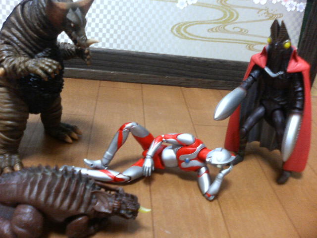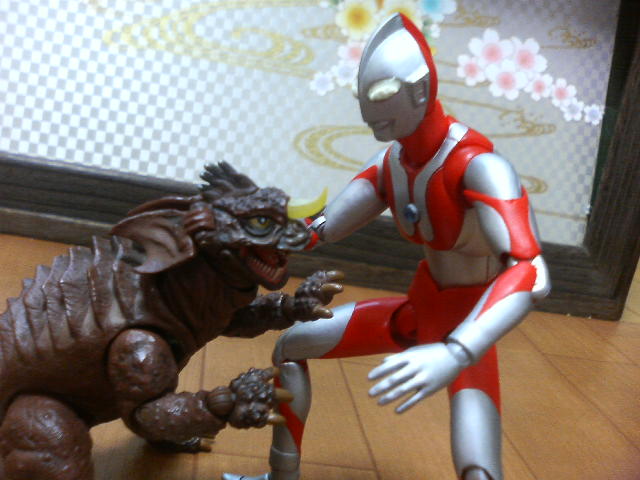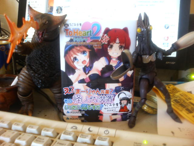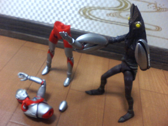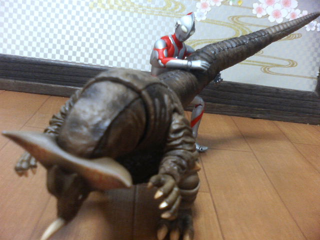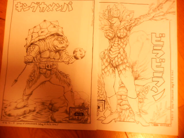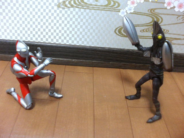 にようやく目を通しました。とはいえ、本文は何度も何度も読み返したので、イラストを中心に。いつものことですが『オォ、ココを絵にしましたか、すッげえ』と感心するばかり。すばらしい。 で、口絵の最後のページこんな但し書きが。 意訳すれば『作者が好き勝手にやっているので、怒らないでね』ということか。とはいえ、ちゃんと出版社とメーカーさんの許可はもらい、厳しいチェックも通りましたのでご安心を。デカイ蟻が出るのに安心できるか! ◎週末は月一回のガイドヘルパーの日。障害を持った人や高齢の方の外出の介助ですな。 昨日は難波まで出かけ、なんばパークスの空中庭園でのんびりしてきました。天気もよく、暑いぐらいの気温。見れば、チョウチョが飛んでいる。もう春だなあ……。 パークス内の映画館は人がごった返していた。あぁ、マクロスFの映画をやっているのだなあ。関係ないけど、ライダー映画のチラシは全滅でした。 ご存知なんばパークスは南海ホークスのホームグラウンド、大阪球場の跡に作られており、ホークスの展示、選手の手形やサインが庭園の中に置かれている。 オォ、あぶさんの手形! と思ったら水島先生のでした。 あぶさんのも作ればいいのに。 しかし、最初はアンオフィシャルな形で連載が始まったのに、いつの間にか引退セレモニーも行われるほどの選手になっていた。 自分のキャラを好きなチームでプレイさせ、現役選手並みの扱いを受けるなんて、オタクの理想形じゃないか、水島先生。 ◎なんばパークスからなんばシティに出て、ぶらぶらと時間をつぶそうと思ったら、なにやら怪しい人が。 怪人だ! おもちゃ屋に怪人が! 怪人キノコ汁男だ! 聞けば、所属する組織『ヤモマーク』のイベントのために、夜行バスに乗って来阪してきたとの事。怪人も大変だ。 名前を読んでおいて、こちらが名乗らないのも失礼な話なので、名刺を渡してご挨拶をする。 ヤモマークとは、レトロ系オリジナル怪獣ソフビのメーカーさんでした。 怪獣を作って売る、まさに夢のような職業だが、『いやあ、なかなかですわ……』とキノコ汁男さんは頭を掻いておられた。 いやあ、憧れるなあ、怪獣商売。俺もその域に行きたい。 キノコ汁男さんのくれた販促塗り絵。イラストがかっこいい! 販促物といえば塗り絵、これ大事! ヤモマークさんのブログ。 大手はともかく、こうやって地道に怪獣商売をやっておられる方がいるんだなあ、俺も営業するときは着ぐるみを着ていかないと。 ◎ 怪人に会ってしまった。バルタン、ゴモラを買ってしまった上はやはり戦わせる相手が欲しい、ということで ウルトラアクト、ウルトラマンを購入。 今まで何度か試行錯誤して、長続きしなかった『関節稼動のウルトラマンおもちゃ』の最新型であり、今のところ、頂点。順調に点数を増やしているバンダイフィギュアーツの流れを汲む可動人形だが、それに加えやはり『戦う相手』もリリースした点が大きいかと。 可動範囲も広く、スペシウム光線の構えや、おなじみの前傾姿勢も取れる。 が、腰と腕のパーツもよく取れる! それでもバルタンと戦わせる。オプションで、八つ裂き光輪やスペシウム光線のエフェクトパーツもついてるのだが、個人的にあれは好きでない。 光線やミサイルは想像の中で飛ばすものだ。 ゴモラと戦わせる。ゴモラはきちんと角がついております。 しかし、ゴモラの重みでひざがカクンと曲がってしまう。 特撮リボルテックのバラゴンと。 対ネロンガ戦を想定……したのだがリボルテックのほうが小さい。 まるで犬をあやしているようにも見える。 各メーカーから可動人形がリリースされているが、スケールが統一されていないので、絡めて遊べないのが残念。 『もういい、寝る!』 ウルトラアクトはこの三体で十分かな、という感じ。 今年はこの規格で平成ゴジラシリーズが出るので、そっちに期待する。ウルトラマンはとにかく、ポロポロ取れるんだよ!