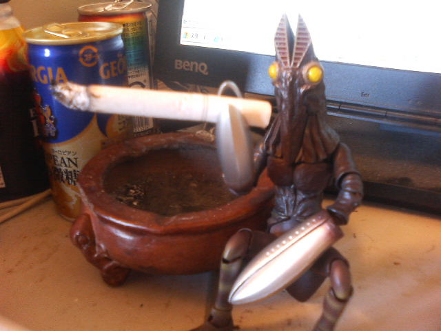 ……という感じになっております。オリジナルを思い切り逸脱してますが、番外編ということで。店頭でお見かけの際はぜひ。相音うしおさんのイラストで、俺の小説オリジナルな衣装を見ることが出来ますよ。 ◎忙しくなった、とか言って、両サイドのブツはなによ? バンダイのこのシリーズは初めてなのだが、可動はすごくいい。でも特撮リボルテックよりもでかいので、遊ばせにくい。 一服するバルタン。 ◎週末締め切りの仕事を終え、気が抜けたのか、鼻風邪を引いてしまった。それに夜勤仕事に出かけると、熱っぽくて頭痛がする。 翌日、頭痛でもうろうとしながら帰宅すると。 ゴーカイオーが置いてあった。 ◎ 小学校でよく配られていた子供映画大会の割引券。今でも思うのだが、アレはどんな組織がやっていたのだろう。 これも、マリオ、アンパンマン、ゾロリ以外は妖怪もので固められているが『ドロロンえん魔くん』がメイン扱いという凄まじい組み合わせ。