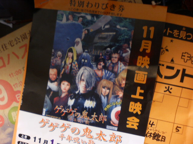 も無事発売し、ご本人自ら日本橋散策と、熱心この上ないが、ポン友の和泉フセヤは『恋盾』が出ても放置プレイかよ、書店に見に行くなり、営業かませよ! とはいえ、俺はといえば、山城新伍の『おこりんぼさびしんぼ』の文庫復刻版を探す毎日。あぁ、これなら前の版をアベ地下の古本屋で買っておくべきだった。 という事で本題。 昔、よく小学校の校門で映画の割引券を配ってるおじさんっていませんでしたか? 映画の内容も、ロードショーものもあれば、市民会館やホールで一日だけやる、アニメや特撮ものの寄せ集めとか、色々で。 とくに後者は、『なんでこんなものを?』みたいなマイナータイトルから、まだ色々緩かった頃のディズニーの短編やら『キン肉マン(ドラえもんでも可)の交通安全』みたいな、ここでしか見れないんじゃないの? と思うようなイベントムービーまで本当に様々。 で、俺はこの手の上映会に一度も行ったことのない子供でした。 割引券の華やかさに心奪われながらも『ピンと来るのがねえ……』と、斜に構えていたこともあったり、親にねだらなかったりと、いろいろな理由がありましたので。 そんな『ちびっこ上映会&割引券配りのおじさん』も新世紀に入って絶えて久しい……、と、思いきや、どっこい、まだ生きていた! 近所の小学校で配っていた割引券を入手! 通報しないで! という事で、懐かしさもあって、ちびっこ上映会に足を運んでみた。 『ゲゲゲの鬼太郎・千年呪い歌』 今夏見逃したやつを、レンタルリリース前に安価で見れる! オトナは割引料金800円! でもこれって昔よくあった二番館のノリだ、うれしい! 場所は巨大ショッピングセンターのちびっこホール。 定期的に子供向けのイベントを行っており、上映会もその一環らしい。今まで知らなかったのだが、上映会は月一で行っていたそうだ。 会場近くにぺたぺたと張られていおる『鬼太郎』ポスターが映画を見ようという気持ちを高揚させてくれる。 そういや、映画のポスターや看板を町中に張ったりすることもなくなったなあ。俺よくパクったりはがしたり……してませんよ。 会場にはいると、おぉ、ちゃんとフィルム上映だ! 俺はてっきりビデオプロジェクターによる上映かと思っていた。 大きな映写機が二台、会場の後ろにでん、と構えている。 これはいいよ、ちびっこには『こうして映画は上映されるんだよ』って教えられますからね。今のちびっこって映画館の映画もDVDで流してるとか思ってるんやないやろうか? スタッフは見たところモギリのおじさんと映写技師のおじさん二人。時間があったので、モギリのおじさんに色々聞いてみた。 何と、今回の上映会でちびっこ上いえ会はファイナルだという。その理由は、シネコンの台頭(近々、市内にもう一件……。もういいよ!)とか、フィルムレンタルに絡む大人の事情とか、客足の減少とか、いろいろあるらしいのだが、何ともさびしい限りだ。 ある意味、いいタイミングで来れたともいえるが……。 客は俺の他に家族連れが二組ほど。百人収容のホールは、どことなくさびしい。 二台の映写機が唸りを上げ、がたたたたたたたたと吠える会場の中で 見たウェンツ鬼太郎は、人間と妖怪の悲恋を描いた良作、に見えた。鬼太郎でなくても成立するかもしれない物語だが、鬼太郎は何もせず、ゴロゴロとして言われるままに動くからその存在が光るのだ。 ヒーローらしからぬ怠け者な感じが原作っぽくていい。 で、ライバル役のぬらりひょんに緒形拳。これが映画では遺作となってしまった。力んだ凄みのある芝居よりも、終盤近くのとぼけた演技が、いかにもナックルぽかった。 遺作が特殊メイクで特撮ものか……。『孔雀王』にも出てたな。 というわけで、少しさびしくもありましたが、なんだかいい気持ちの上映会でありました。こういうのはなくなっちゃいけないと思うのだがなあ。お父様、お母様方も映画はスクリーンで是非。 ◎ ↑ 隣のグランドでは消防訓練なのか、消防車大集合、今日も退屈せずに済むぜ。 ◎ 『007・慰めの報酬』の主題歌。前回がめちゃくちゃかっこよすぎたから、今回はどうか、と思ったが、うむ、誠に立派なボンド節。 |