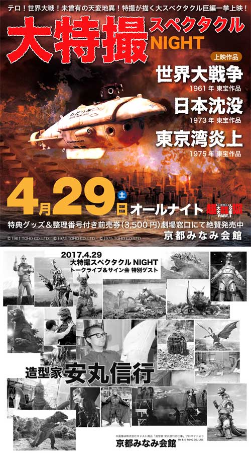 大特撮スペクタクルNIGHTのラインナップは昨年と同じく『東京湾炎上』『日本沈没』に先の『世界大戦争』も含めた被害規模が徐々に拡大する三本。今回はゲストに造形家の安丸信行さんを迎えてのトーク、今回も中村社長とコンビで司会を仰せつかることになりました。70年代東宝怪獣含め、その他膨大な仕事量を誇る安丸氏のトークはとても楽しく、こっちは聞き手に回ってひたすら相槌を打っておりました。すごーい。