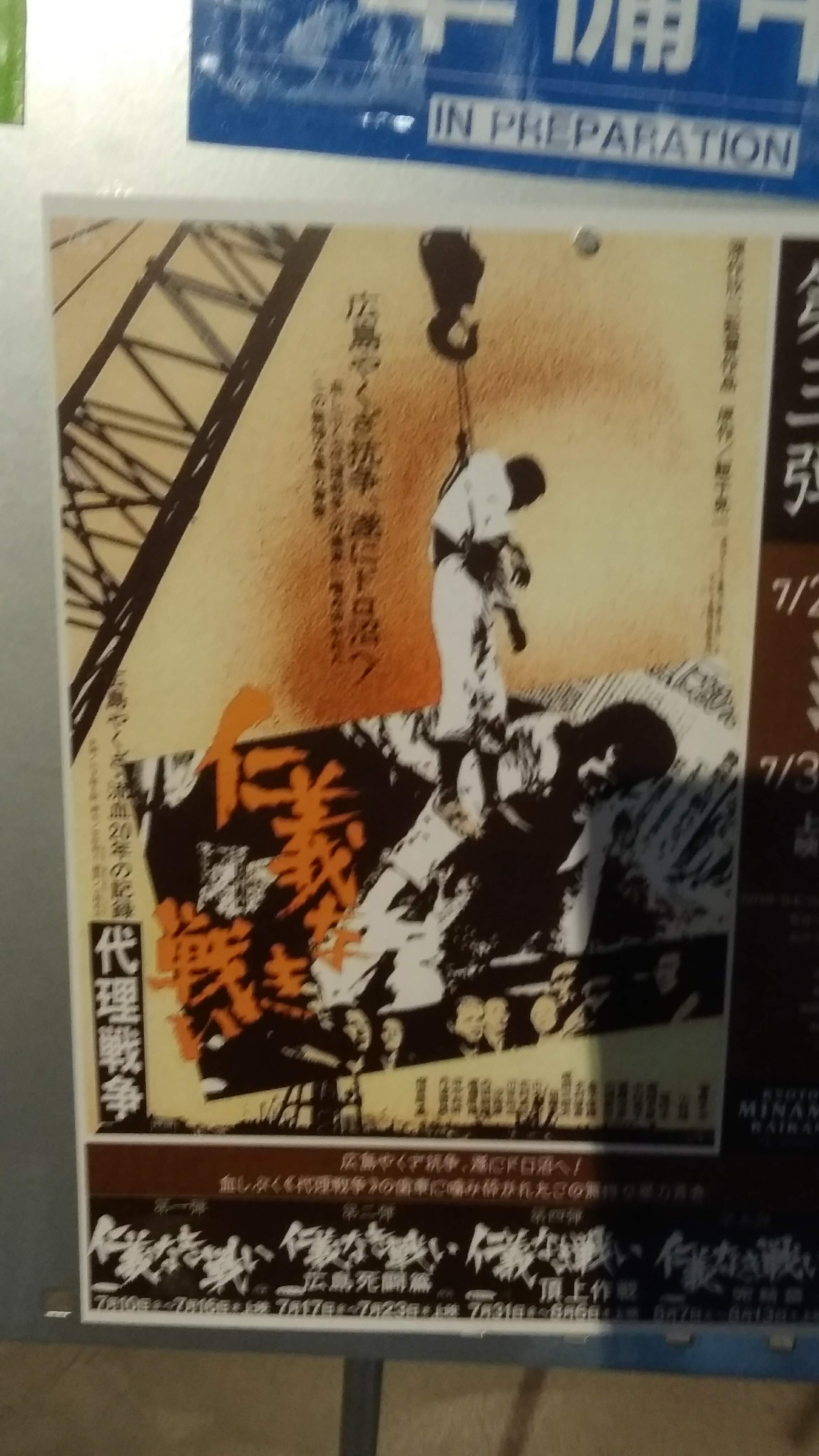 今週も仕事明けにバイクで京都へ。『仁義なき戦い広島死闘編』である。シリーズ2作目にして最高傑作ともうたわれてますが、これ、ちゃんと見ると、主演の菅原文太がほとんど動かない、実質北大路欣也が主演の映画なんですな。一作目と同じく闇市から始まり、前作の主人公、広能と同じく諍いから組織に拾われ、義のため、女のために走る男、山中の物語。結局、彼らのやってきたことは大人(組織)の利益になることばかりで、彼もまたコマの一つに過ぎなかった。