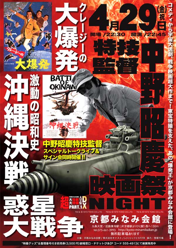 そして、今夜は京都みなみ会館で特技監督中野昭慶映画祭NIGHT。司会ですよ、緊張します。