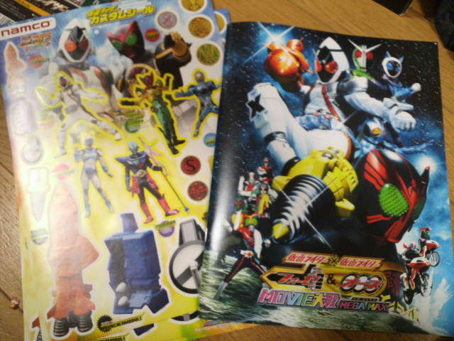 北米版平成ガメラブルーレイは、三本の映画をディスク二枚に収めた不思議な構成。もともとG1G2のカップリング版と、G3の単体版が出ており、それを箱にまとめただけの代物。しかもかなりきつく箱詰めしてるので一度出すとも元に戻すと箱が変形してしまう。しかも困ったことに、これだけうちのデッキで再生できた。ブルーレイが壊れてるのに、なぜ? 子供曰く『中身はDVDなのでは?』とのこと。ありうるかもしれない。 50年大怪獣映画をまとめた『クラシックモンスターボックス』の1、2巻。これも単品をフィギュアつきで箱にまとめたもの。 恐竜グワンジ対放射能Xというマニアックな対決ごっこが出来るのだ。 ◎大事なことは俺の留守中に何でも決まる。仕事明けて帰ってくると、家族が俺を待ちかねていた。『早くジョーシン行くで!』 どうやら、なぜだか分からないが、おじいちゃんが孫のクリスマスプレゼントのために任天堂Wiiを買いに行くとのこと。いつ決まったそんな大事なこと? ゲーム機なんて決して高くない買物だぜ?折込チラシのおもちゃ特集見ただけで決めてもいいんかいな? まあ、今まで購入の話はあがっており、『中古でもいいんじゃないの?』ということになっていたのだが、いきなりの新品、いきなりのスーパーマリオ。 うちに家庭用ゲーム機が来るのは、エポック社のテレビベーダー以来だ。 ゲームキューブともソフトの互換が出来るので『ゴジラ怪獣大乱闘』でも買おうかな。 ◎そして翌日。『映画行くで!』 封切り翌日に行くのかよ、それも俺のいない間に決まったことらしい。というわけで、日曜朝、テレビで本編を見てから『仮面ライダー×仮面ライダー・フォーゼ&オーズMOVIE大戦MEGAMAX』を見に行くことにする。多彩なゲストキャラ満載で見るものの期待値をあげるのがヒーロー映画の常になってきているのだが、春のライダーで全員集合やってるし、今度はどんな手で来るのかいな? それ に年末のライダー映画は過去二作とも、少々アレな内容だっただけに、期待半分で見た。 物語冒頭、世界中で悪の財団Xと戦う一号~ストロンガーの7人ライダー。バックに流れる『戦え!7人ライダー』のアレンジBGM! おぉぉ、ここで心鷲づかみにされ、後は息つく暇もなく(尺が短いせいもあるが)、一気にラストまで突っ走る! しかし今年は春、夏のライダー映画(ライダー戦闘シーンの主題歌アレンジと暴れん坊将軍のテーマ)、それに今回とザボーガーで菊池俊輔サウンドを劇場で聞くことの多い年だった。幼少時より菊池サウンドを当たり前のように聞いていたおっさんは、劇場で1フレーズでも流れようものなら『おぉ!』と反応してしまうのだ。 オーズはテレビ最終回からの後日談、フォーゼはテレビ本編の一遍的に物語が処理されていて、よどみのない流れ。ほんの顔見世程度かと思っていたWもガッツリと本編に食い込む活躍、平成3人ライダー&昭和7人ライダーがそろい立つ! こうも大勢だと『現行ライダーを立てるために、過去ライダーはその他大勢扱い』な展開になりがちだが、奇跡的にどのライダーに見せ場が用意されている! W、オーズ、フォーゼの関係もうまく旧作から引き継いでますし、戦闘場面では出し惜しみせず、3人の主題歌を流す。戦闘中に主題歌が流れると俄然燃えてくるのは日本人だけの習性なのか? 何度もいうけど、歌は大事なんだよ! しっかしまあ、なにこの喉越しのよさ! 何で今までこうしなかったの? という野暮は置いといて、短い尺数の中に(主にアクションを)詰めるだけ詰め込んだ奇跡の傑作だったのでした。 途中のある場面で『鬼太郎が半魚人にかまぼこにされて、それを仲間が買い戻すエピソード』を思い出したが、たぶん自分だけだろう。 映画が終わって、劇場下のゲームセンターでもらった、ライダー塗り絵。 白一色のフォーゼはどこを塗れというのだ? 前回の日記より。試写で先行販売されていた『WILD7』のパンフと、思わず読み返した原作漫画。パンフは、銃器とバイクのことが知りたくて、買った。つくづく惜しい映画だった。いや、アクションはいいのよ。せっかく70年代の7人ライダーが大活躍してるのに、こっちのライダーさんたち(あ、こっちも7人か!)ももっと頑張ってほしかった。