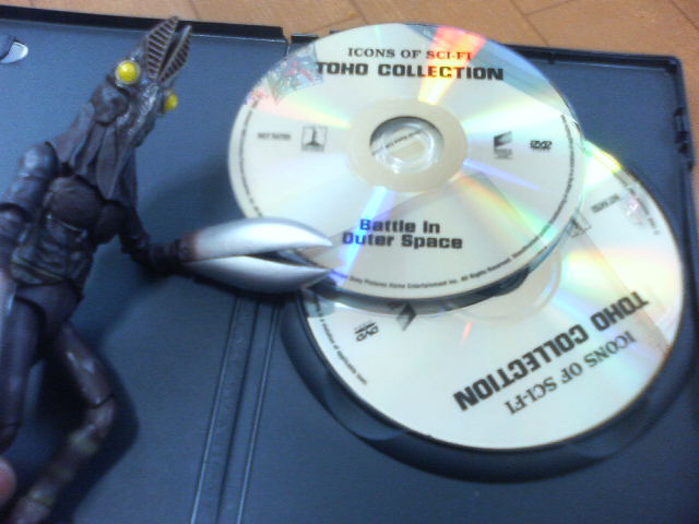 それでも心静かに、吉報が届く努力はしているつもり。 さて。 いつものショップで 特撮リボルテック・バットマンがべらぼうに安かったので『今買わないで後悔するより、買って後悔した方がまし』と購入する。 可動はもちろんのことだが、マントも三枚に分割、劇中のイメージを大事にしております。 まるで青空が、そしてヒーローポーズが似合わないヒーロー、バットマン。ゴッサムは今日も雨だった。 うちで絡ませられるのはソフビ怪獣だけだよ! がんばれバットマン! 嘘かマコトか、ゴジラシリーズの没企画の中に『ゴジラ対バットマン』というのがあったそうだ。 等身大ヒーロー対巨大怪獣の設定はかなり無理があると思うが、実現していればバットマンはフランケンのように巨大化、もしくはスパイダーマンのように日本オリジナル巨大ロボを……。 でも企画時期から考えると、バットマンはあの青いスーツでの登場だったんでしょうな。 海外ヒーローの次は海外DVD。 これまたべラボーな安さだったのでおもわずポチった『TOHO-COLLCTION』。東宝特撮映画の北米版DVD三本パック。 以前購入した『TOHO- PACK』のようにボックス仕様でくるかと思ったら、なんとケースが一つ。 へ? と思い中を開けると ホルダー一つにディスク三枚がぶっ差してある! コロンビアピクチャーズの正規品ですよ。 実にアメリカンな仕様だ。『本編見れればいいんでしょ? どうして日本のDVDは外側にこだわるのレスカ?』 というメーカーさんの声が聞こえてきそうだ。 内容は『モスラ』『宇宙大戦争』『美女と液体人間』のバラエティに富んだ三本。 目的は『モスラ』だったのですが、これがまあ、画質も申し分なく、日本語音声ノーカットでいうことありませんでした。巨大な芋虫がその時代のシンボルをへし折るビジュアルは今見ても鮮烈ですな。 ディスク一枚につき、日本語版とえ海岸版の2バージョンが収録。日本正規品のような映像特典がないのが残念ですが、美麗画質の本編さえみれりゃあええ。わしと竜馬さえおりゃいいんだ。 同じ特典なしのデアゴスティーニ一冊分で三作見れるお買い得品でありました。 と、ささやかな幸せを満喫しつつ、次へ邁進したいと思います。 夏のオーズ映画で こんなことされたらねえ、がんばるしかないですよ。